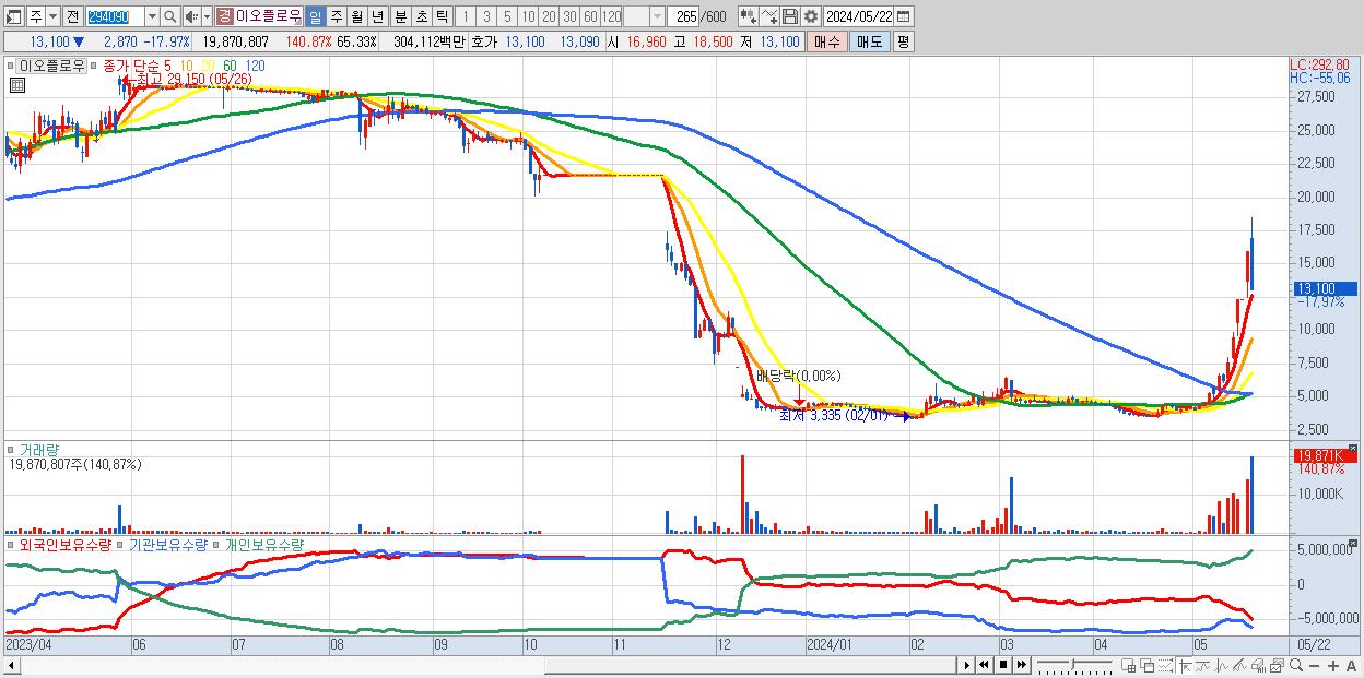 - 이오플로우 (13,100원 ▼ -17.97% , 시총: 3,985억, 거래량: 19,870,807, 거래대금:3,041억)