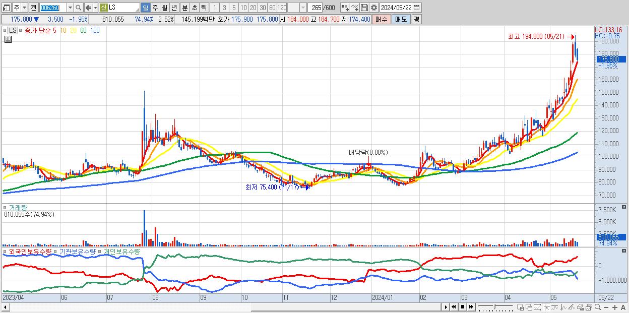 - LS (175,800원 ▼ -1.95% , 시총: 56,608억, 거래량: 810,055, 거래대금:1,452억)