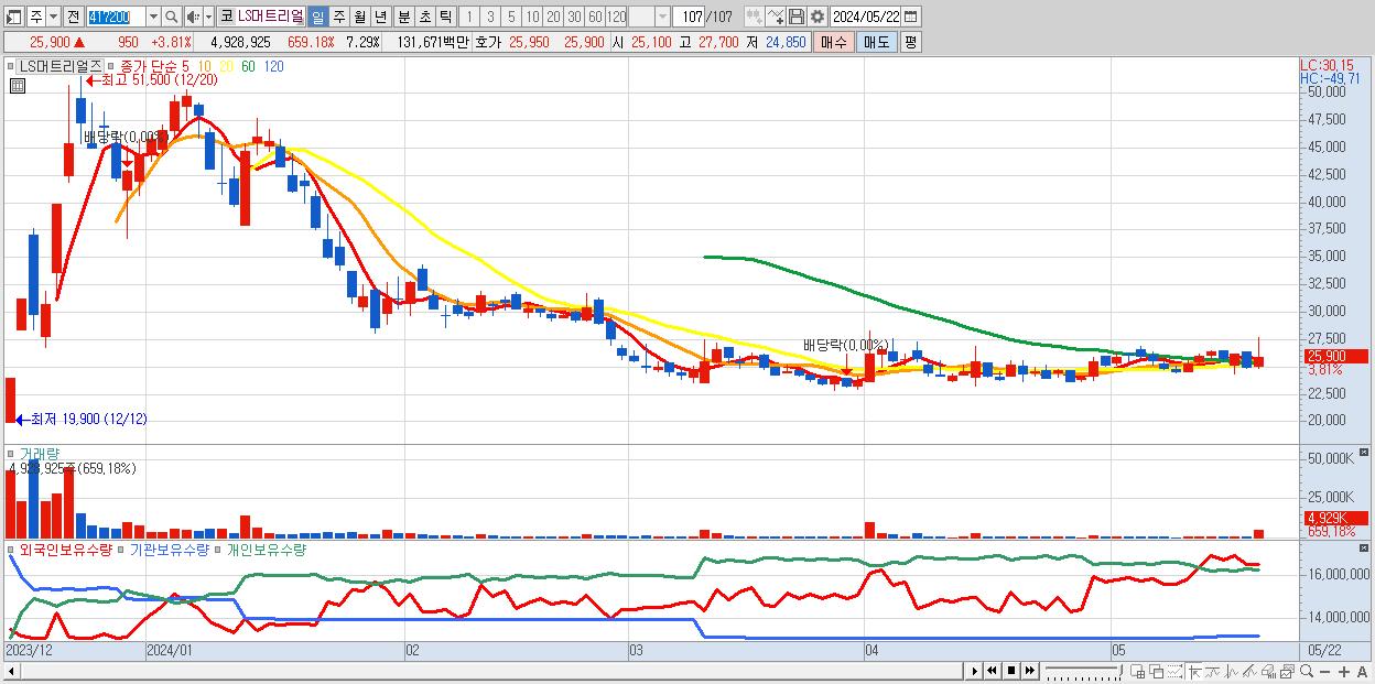 - LS머트리얼즈 (25,900원 ▲ 3.81% , 시총: 17,522억, 거래량: 4,928,925, 거래대금:1,317억)