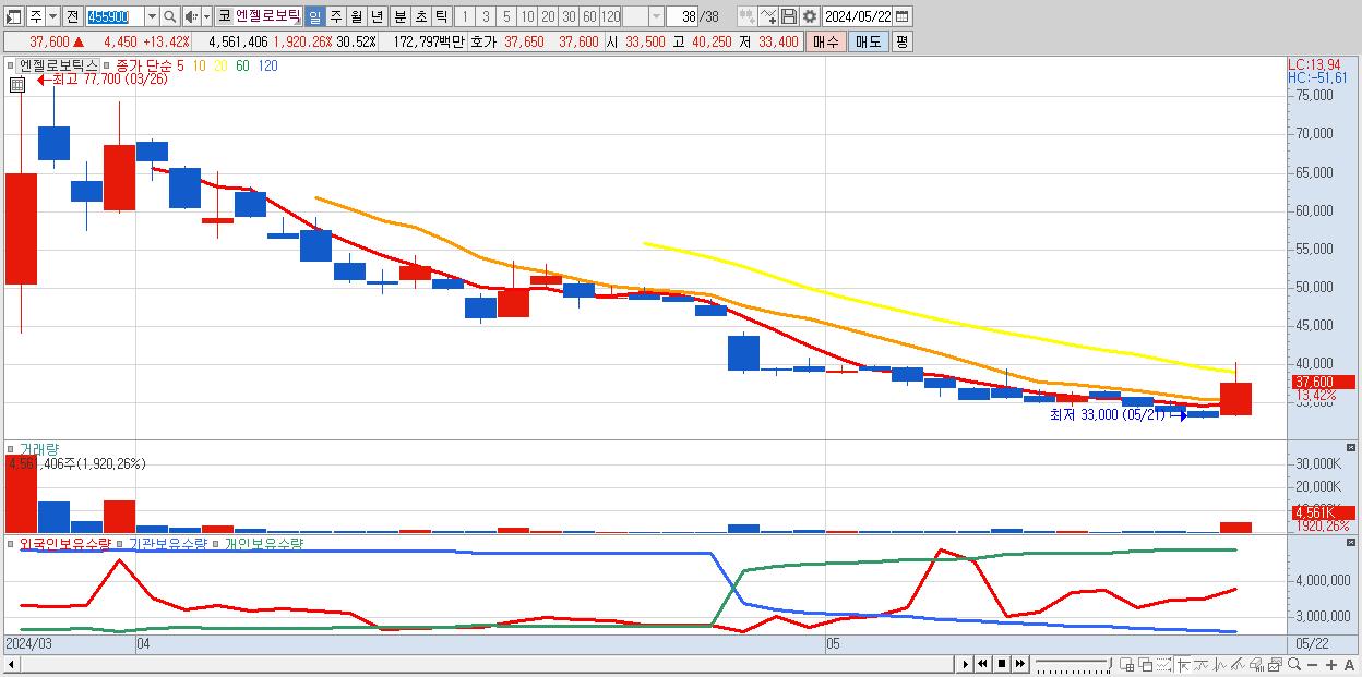 - 엔젤로보틱스 (37,600원 ▲ 13.42% , 시총: 5,619억, 거래량: 4,561,406, 거래대금:1,728억)