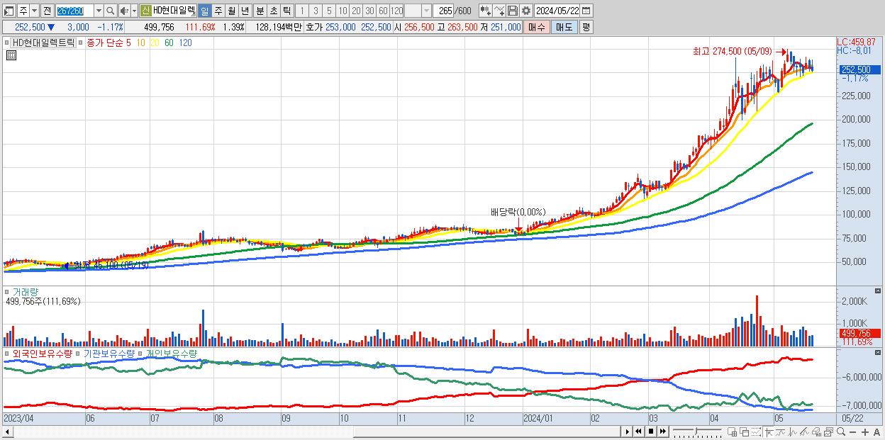 - HD현대일렉트릭 (252,500원 ▼ -1.17% , 시총: 91,019억, 거래량: 499,756, 거래대금:1,282억)