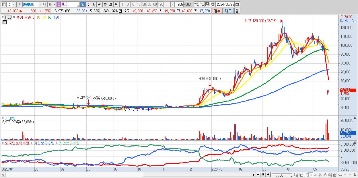 - HLB (49,300원 ▲ 1.65% , 시총: 64,507억, 거래량: 6,976,093, 거래대금:3,401억)