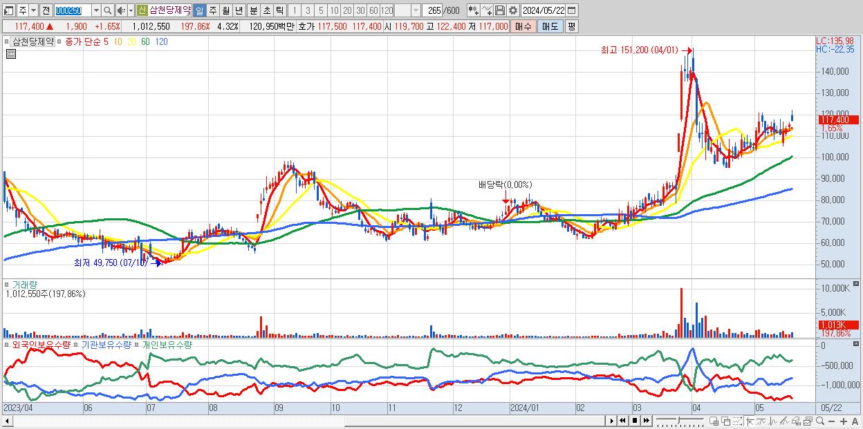 - 삼천당제약 (117,400원 ▲ 1.65% , 시총: 27,539억, 거래량: 1,012,550, 거래대금:1,210억)