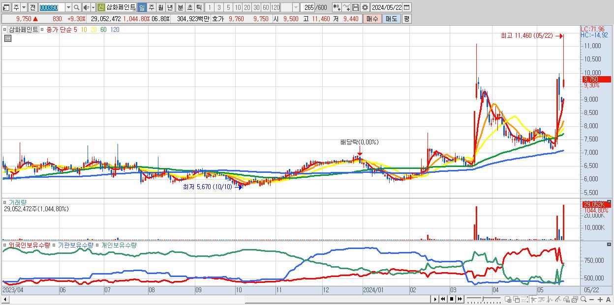 - 삼화페인트 (9,750원 ▲ 9.3% , 시총: 2,652억, 거래량: 29,052,472, 거래대금:3,049억)