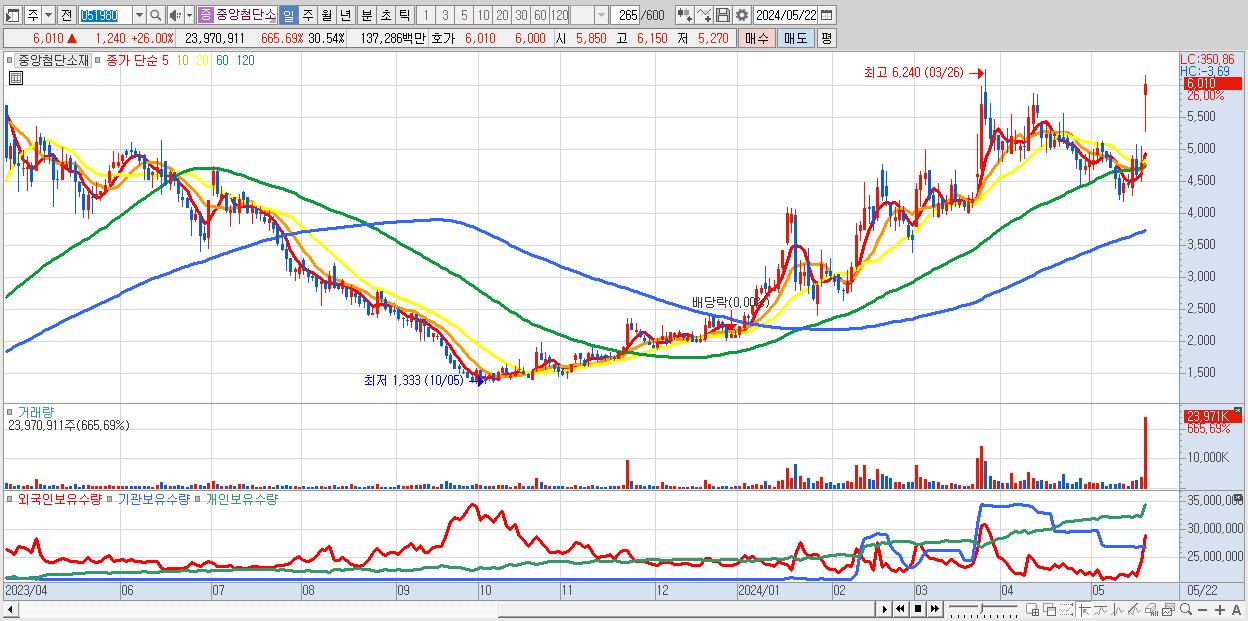 - 중앙첨단소재 (6,010원 ▲ 26% , 시총: 4,718억, 거래량: 23,970,911, 거래대금:1,373억)