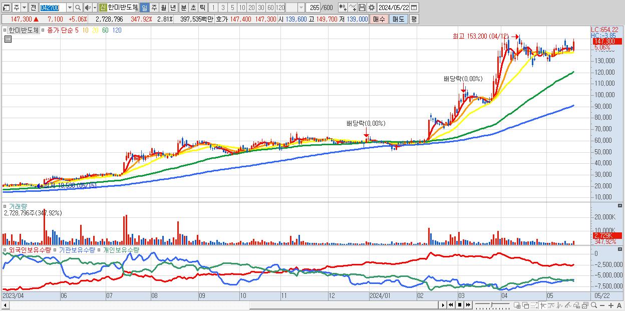 - 한미반도체 (147,300원 ▲ 5.06% , 시총: 142,872억, 거래량: 2,728,796, 거래대금:3,975억)