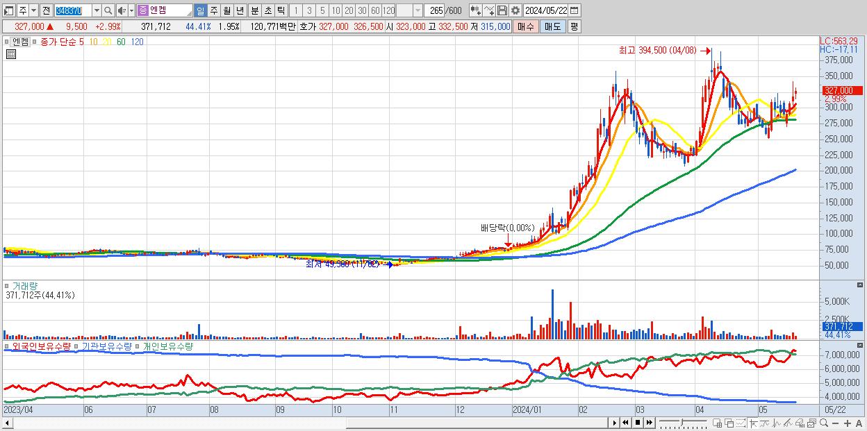 30.엔켐 327,000원 ▲ 2.99% (KOSDAQ, 348370)