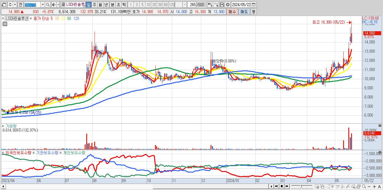 - LS마린솔루션 (14,980원 ▲ 5.87% , 시총: 3,886억, 거래량: 8,614,309, 거래대금:1,311억)