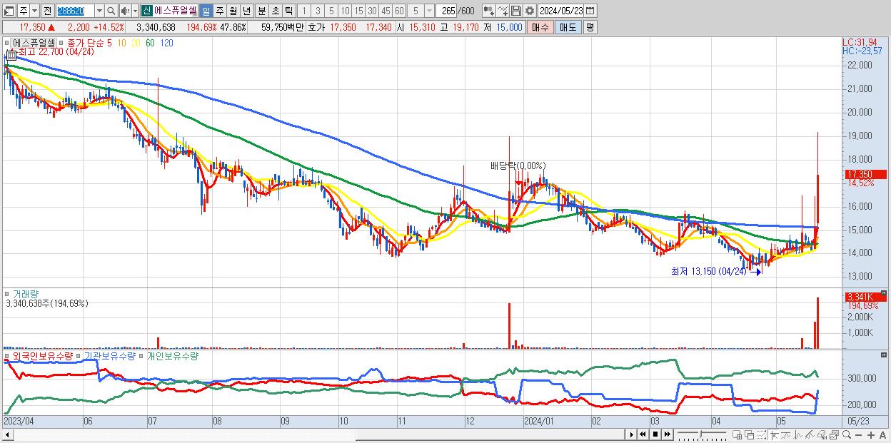 - 에스퓨얼셀 (17,350원 ▲ 14.52% , 시총: 1,211억, 거래량: 3,340,638, 거래대금:597억)