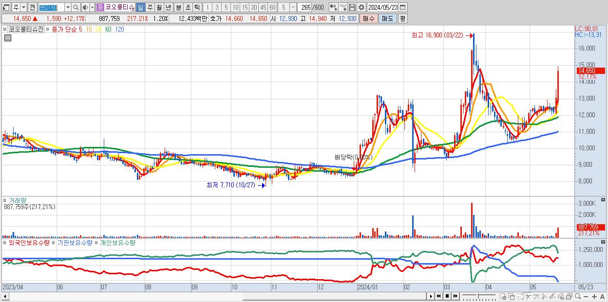 - 코오롱티슈진 (14,650원 ▲ 12.17% , 시총: 10,881억, 거래량: 887,759, 거래대금:124억)
