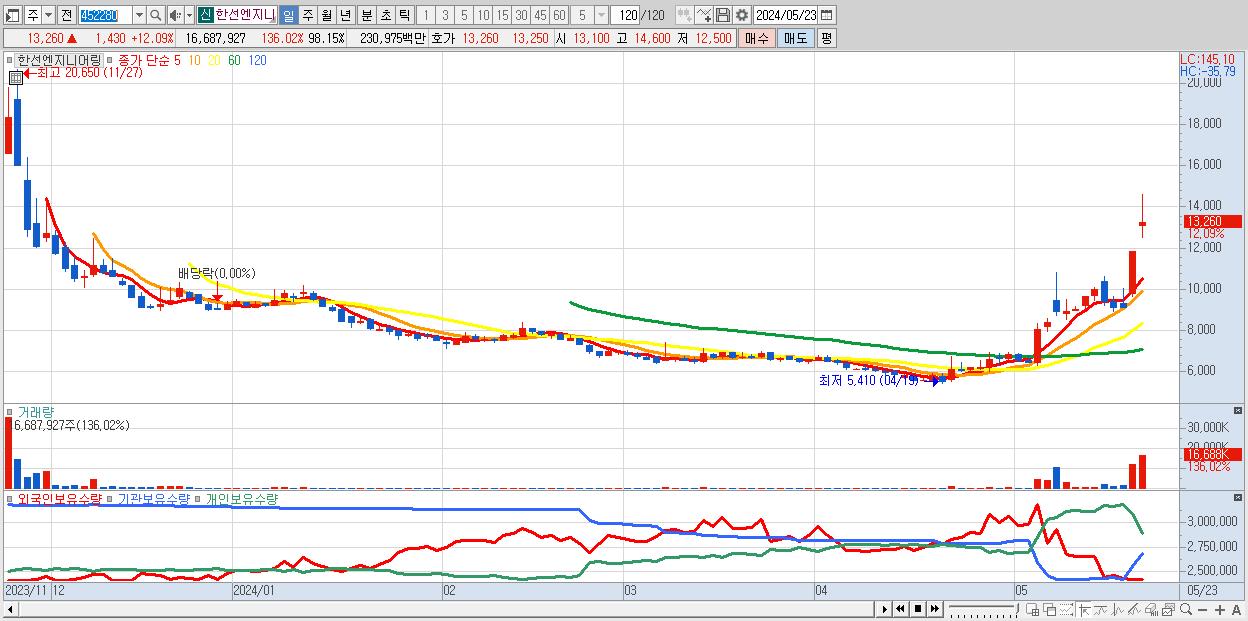 - 한선엔지니어링 (13,260원 ▲ 12.09% , 시총: 2,255억, 거래량: 16,687,927, 거래대금:2,310억)