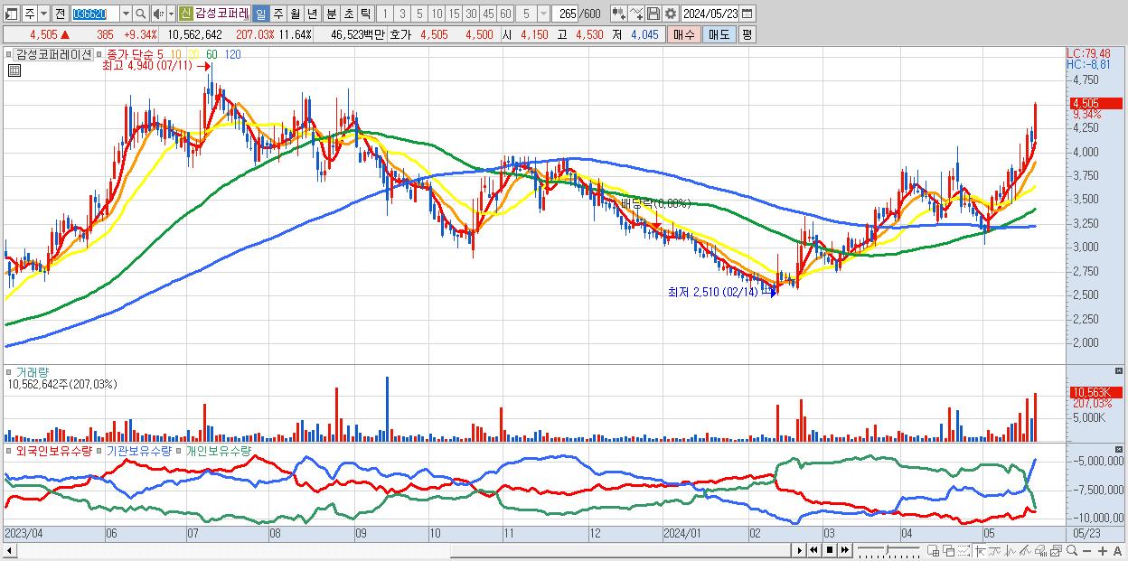 - 감성코퍼레이션 (4,505원 ▲ 9.34% , 시총: 4,088억, 거래량: 10,562,642, 거래대금:465억)