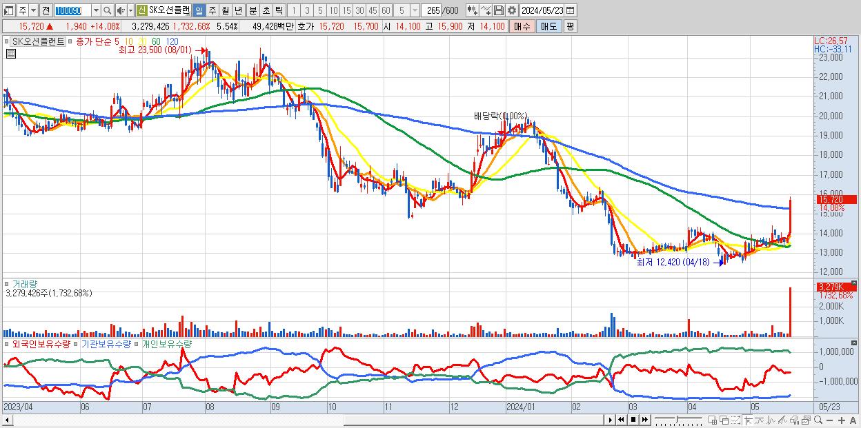 - SK오션플랜트 (15,720원 ▲ 14.08% , 시총: 9,306억, 거래량: 3,279,426, 거래대금:494억)