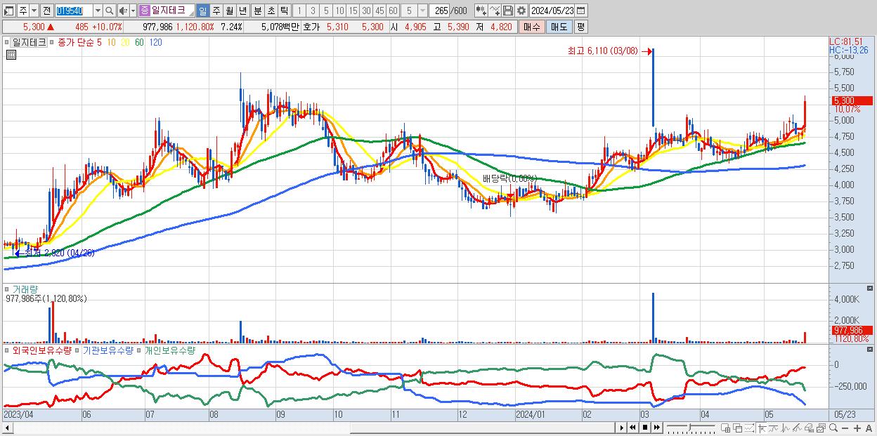 - 일지테크 (5,300원 ▲ 10.07% , 시총: 716억, 거래량: 977,986, 거래대금:51억)