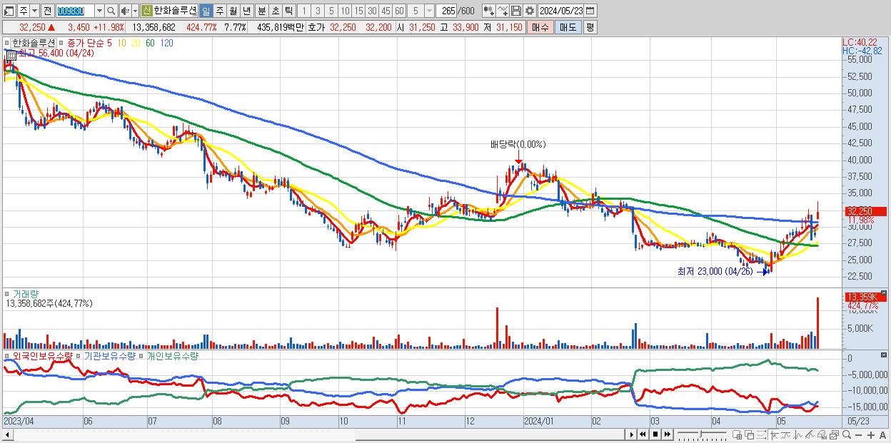 - 한화솔루션 (32,250원 ▲ 11.98% , 시총: 55,435억, 거래량: 13,358,682, 거래대금:4,358억)