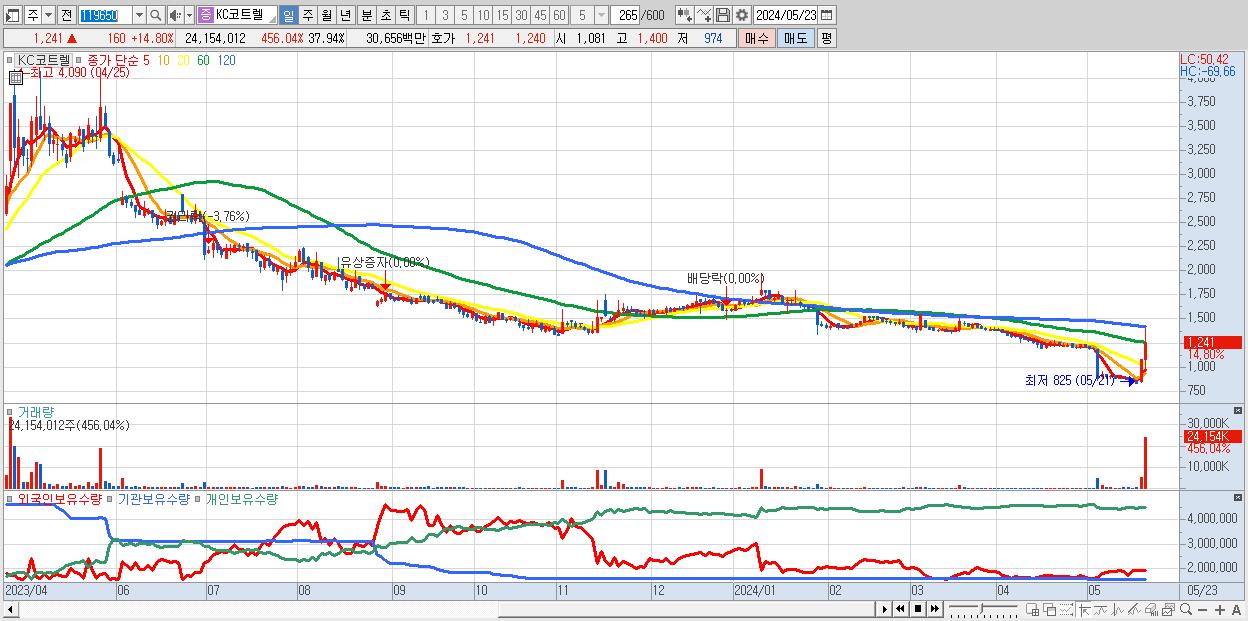 - KC코트렐 (1,241원 ▲ 14.8% , 시총: 790억, 거래량: 24,154,012, 거래대금:307억)
