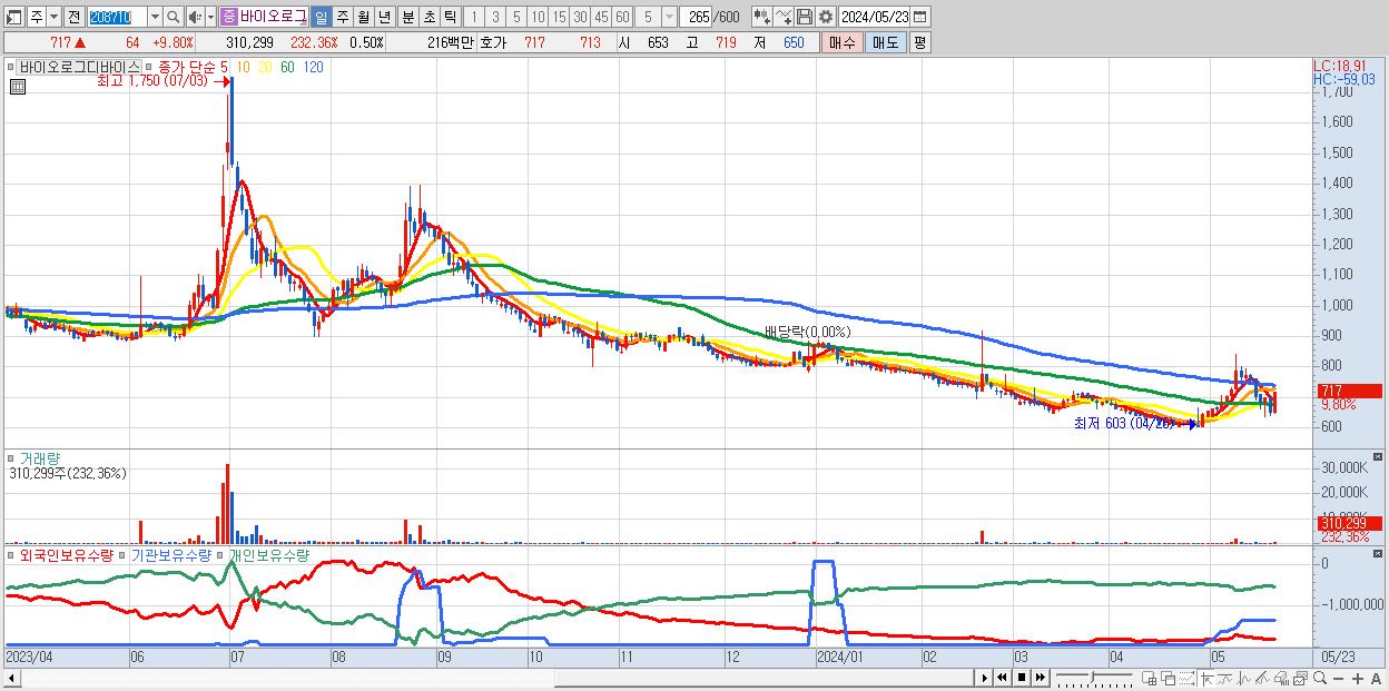 - 바이오로그디바이스 (717원 ▲ 9.8% , 시총: 449억, 거래량: 310,299, 거래대금:2억)