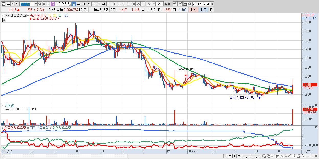 - 성안머티리얼스 (1,416원 ▲ 17.02% , 시총: 999억, 거래량: 13,471,210, 거래대금:193억)