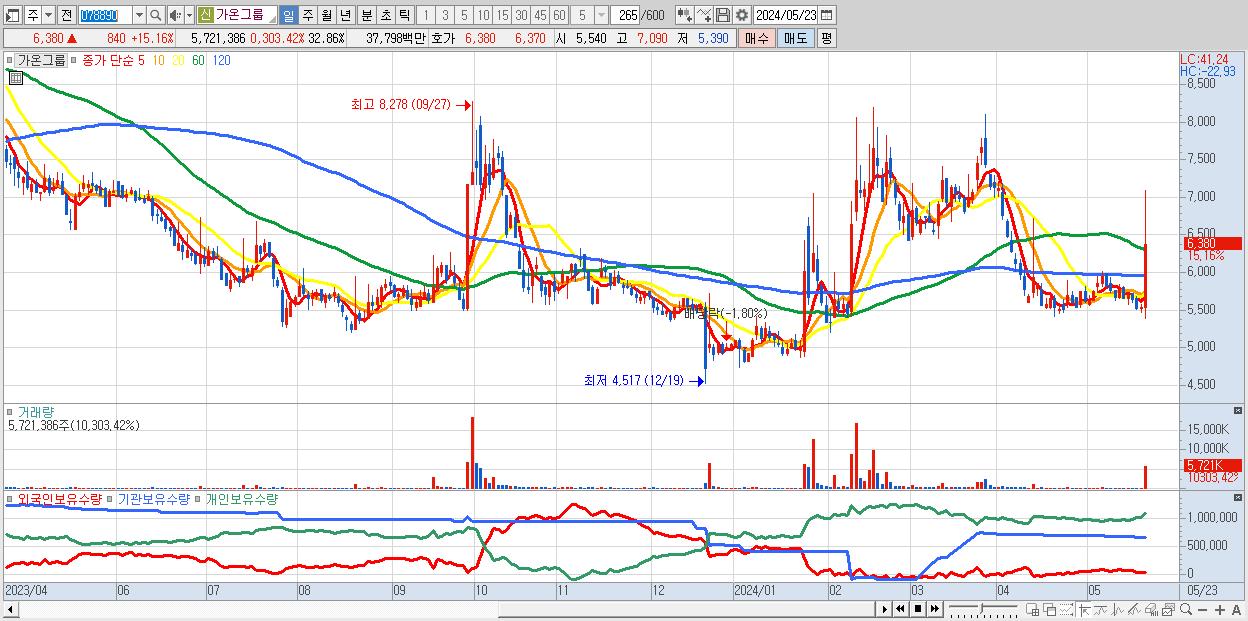 - 가온그룹 (6,380원 ▲ 15.16% , 시총: 1,111억, 거래량: 5,721,386, 거래대금:378억)
