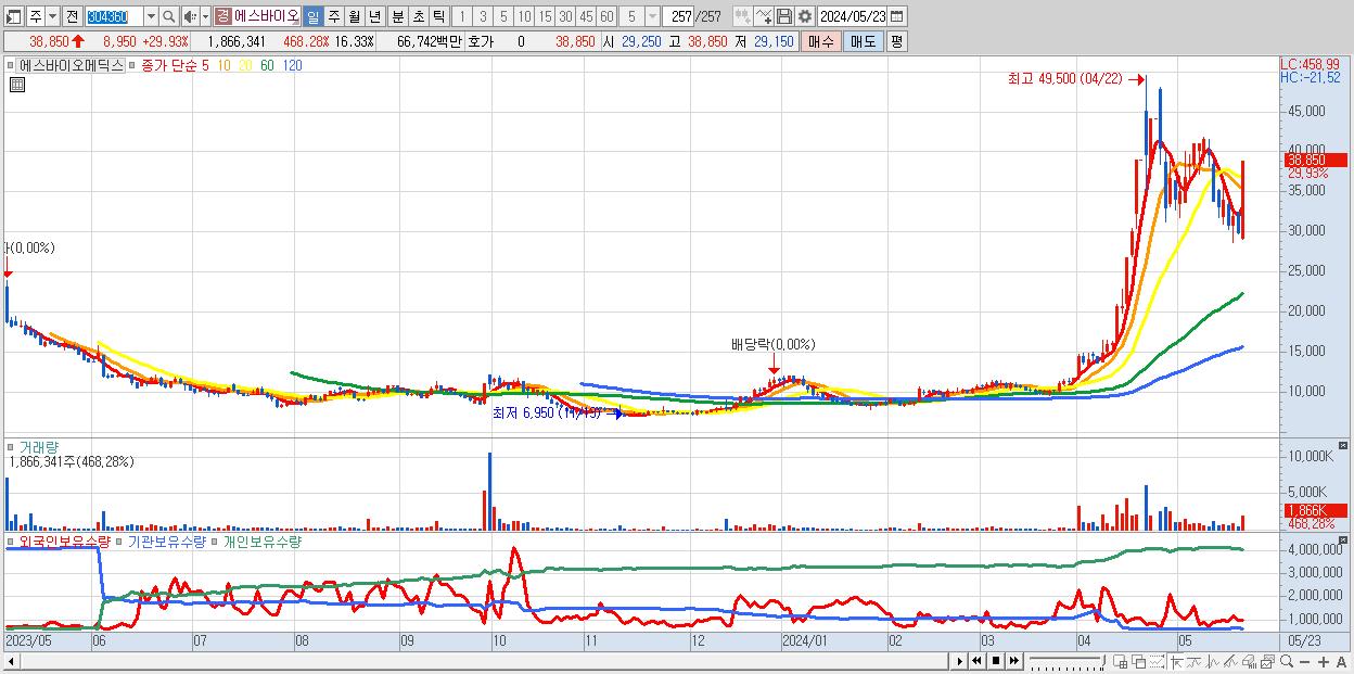- 에스바이오메딕스 (38,850원 ▲ 29.93% , 시총: 4,439억, 거래량: 1,866,341, 거래대금:667억)