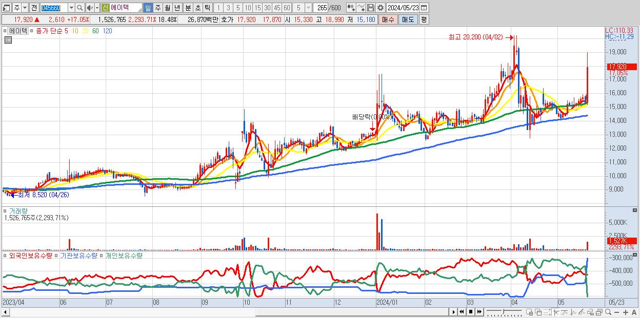 - 에이텍 (17,920원 ▲ 17.05% , 시총: 1,480억, 거래량: 1,526,765, 거래대금:269억)