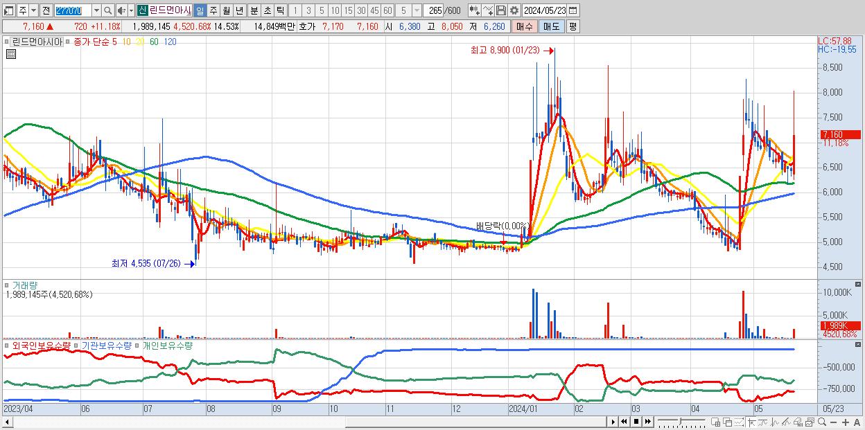 - 린드먼아시아 (7,160원 ▲ 11.18% , 시총: 980억, 거래량: 1,989,145, 거래대금:148억)