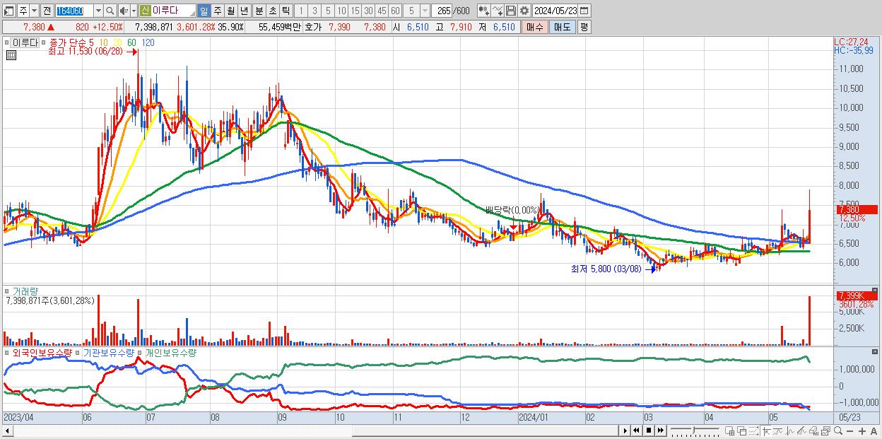 - 이루다 (7,380원 ▲ 12.5% , 시총: 1,521억, 거래량: 7,398,871, 거래대금:555억)