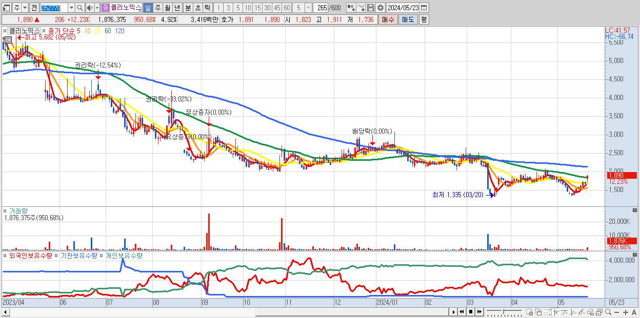- 클리노믹스 (1,890원 ▲ 12.23% , 시총: 721억, 거래량: 1,876,375, 거래대금:34억)