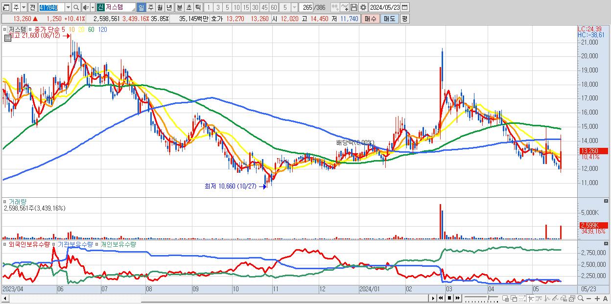 - 저스템 (13,260원 ▲ 10.41% , 시총: 961억, 거래량: 2,598,561, 거래대금:351억)