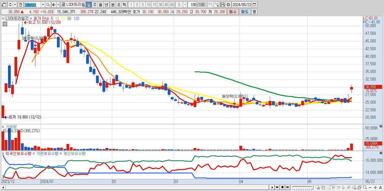 - LS머트리얼즈 (30,050원 ▲ 16.02% , 시총: 20,330억, 거래량: 15,046,371, 거래대금:4,463억)