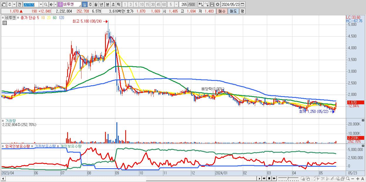 - 비투엔 (1,670원 ▲ 12.84% , 시총: 568억, 거래량: 2,232,804, 거래대금:36억)