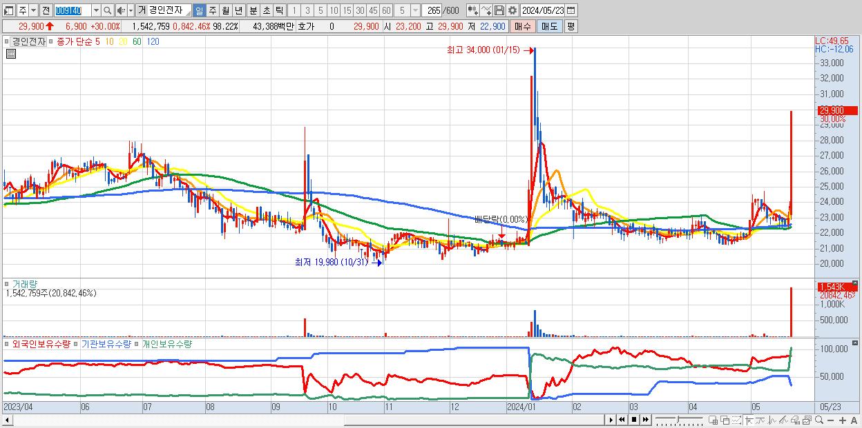 2.경인전자 29,900원 ▲ 30% (KOSPI, 009140)