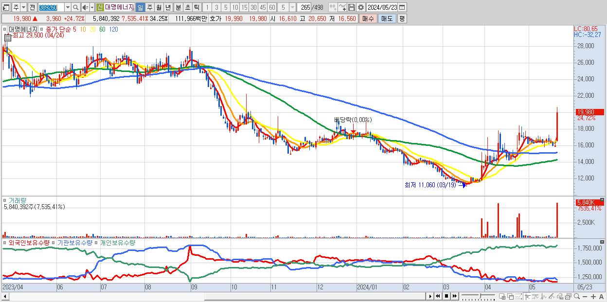 - 대명에너지 (19,980원 ▲ 24.72% , 시총: 3,407억, 거래량: 5,840,392, 거래대금:1,120억)