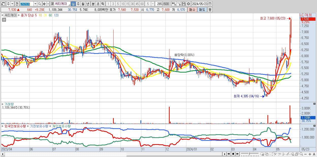 - 씨티케이 (7,530원 ▲ 9.29% , 시총: 1,456억, 거래량: 1,109,344, 거래대금:80억, KOSDAQ)