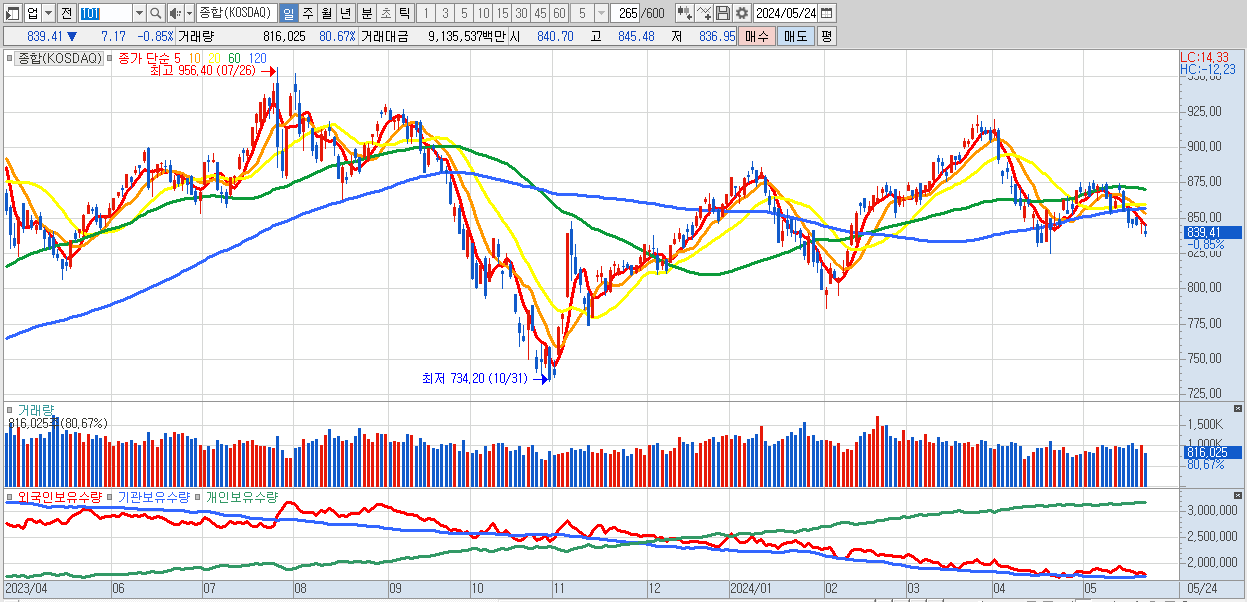 | 05/24 | 839.41 | ▼-0.85% | 321억 | -77억 | -30억 | -213억 |