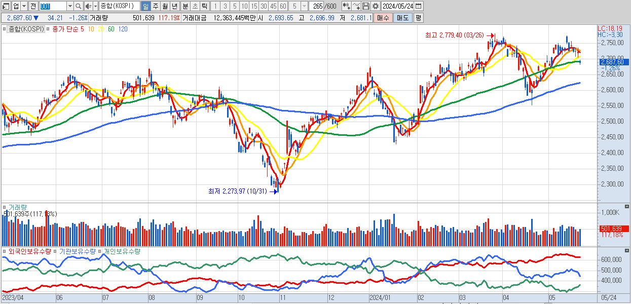 | 05/24 | 2,687.60 | ▼-1.26% | 12,406억 | -3,080억 | -9,221억 | -105억 |