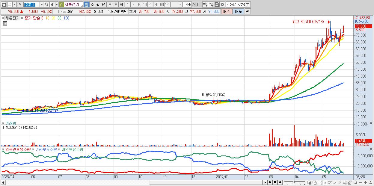 - 제룡전기 (76,600원 ▲ 6.39% , 시총: 12,304억, 외국인 순매수 거래금:90억)