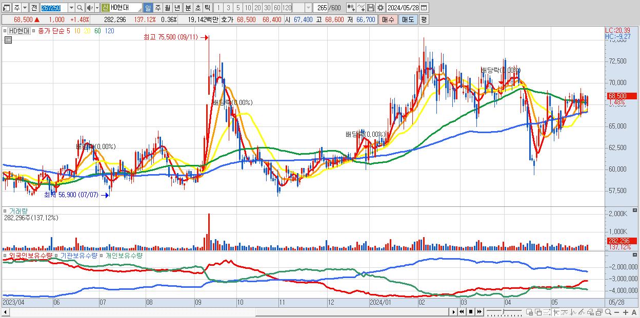 - HD현대 (68,500원 ▲ 1.48% , 시총: 54,110억, 외국인 순매수 거래금:70억)