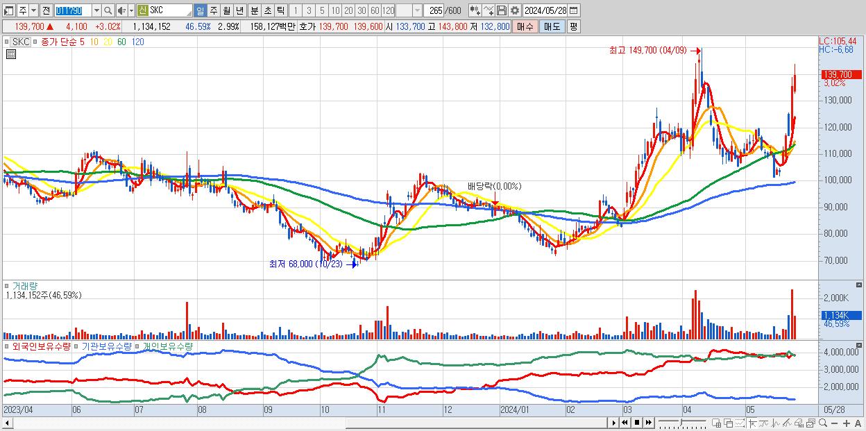 - SKC (139,700원 ▲ 3.02% , 시총: 52,902억, 외국인 순매수 거래금:88억)