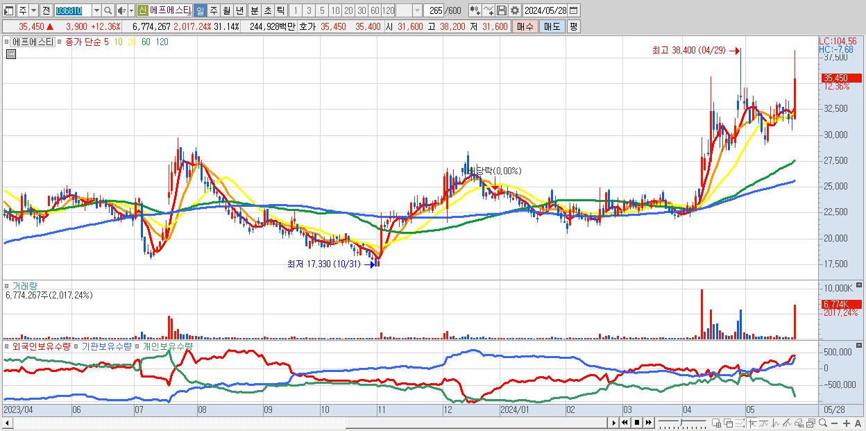 - 에프에스티 (35,450원 ▲ 12.36% , 시총: 7,713억, 외국인 순매수 거래금:69억)
