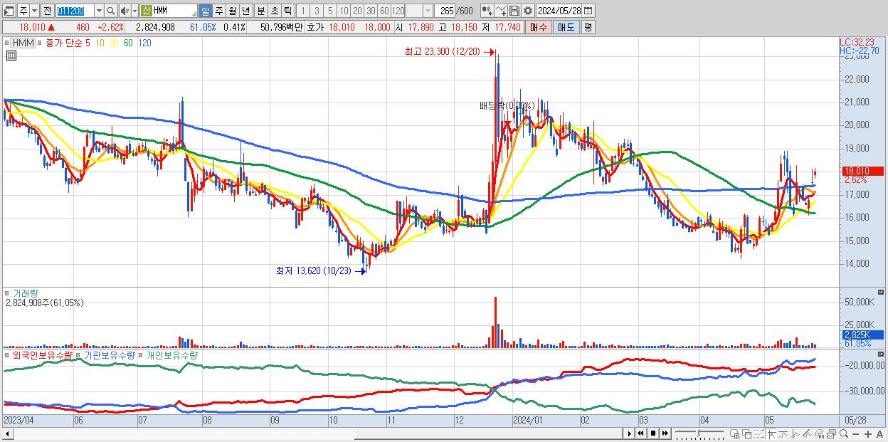 - HMM (18,010원 ▲ 2.62% , 시총: 124,096억, 외국인 순매수 거래금:43억)