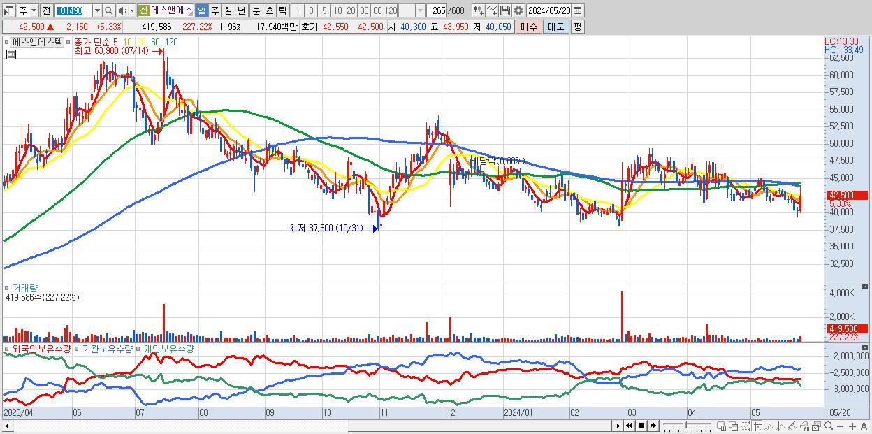 - 에스앤에스텍 (42,500원 ▲ 5.33% , 시총: 9,117억, 외국인 순매수 거래금:49억)