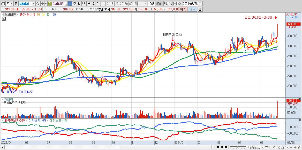- 솔브레인 (343,500원 ▲ 11.35% , 시총: 26,719억, 외국인 순매수 거래금:108억)