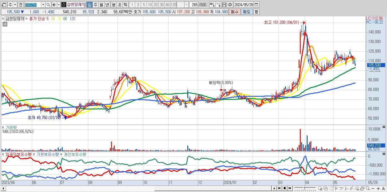 - 삼천당제약 (105,500원 ▼ -1.49% , 시총: 24,748억, 외국인 순매수 거래금:53억)