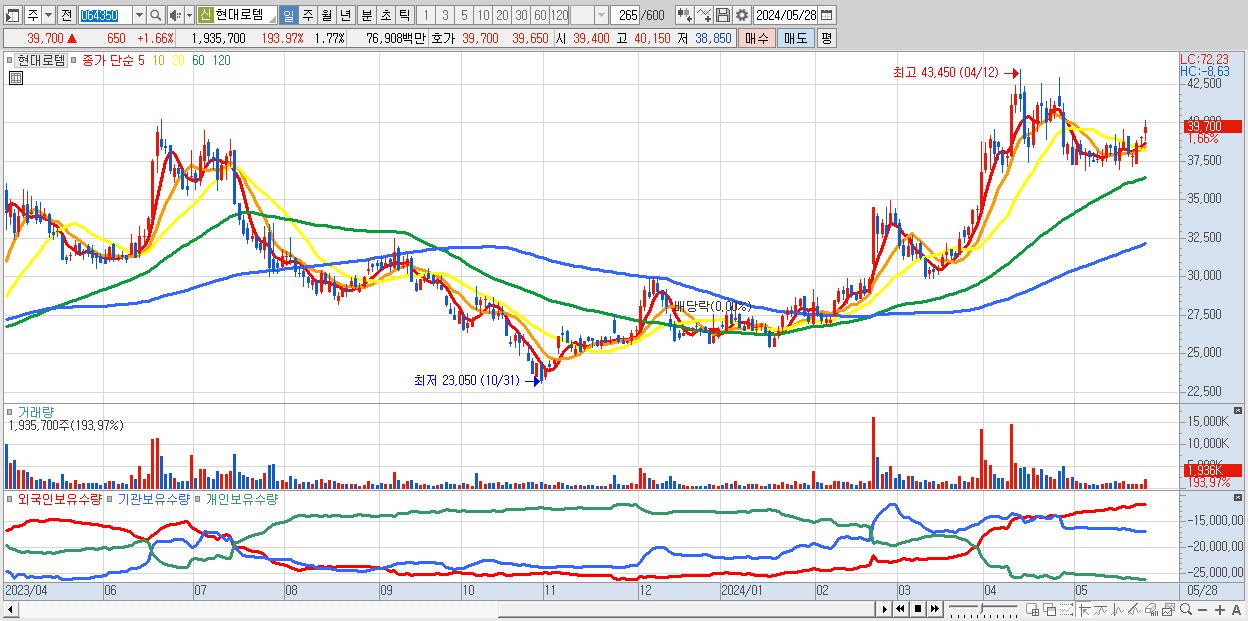- 현대로템 (39,700원 ▲ 1.66% , 시총: 43,329억, 외국인 순매수 거래금:81억)