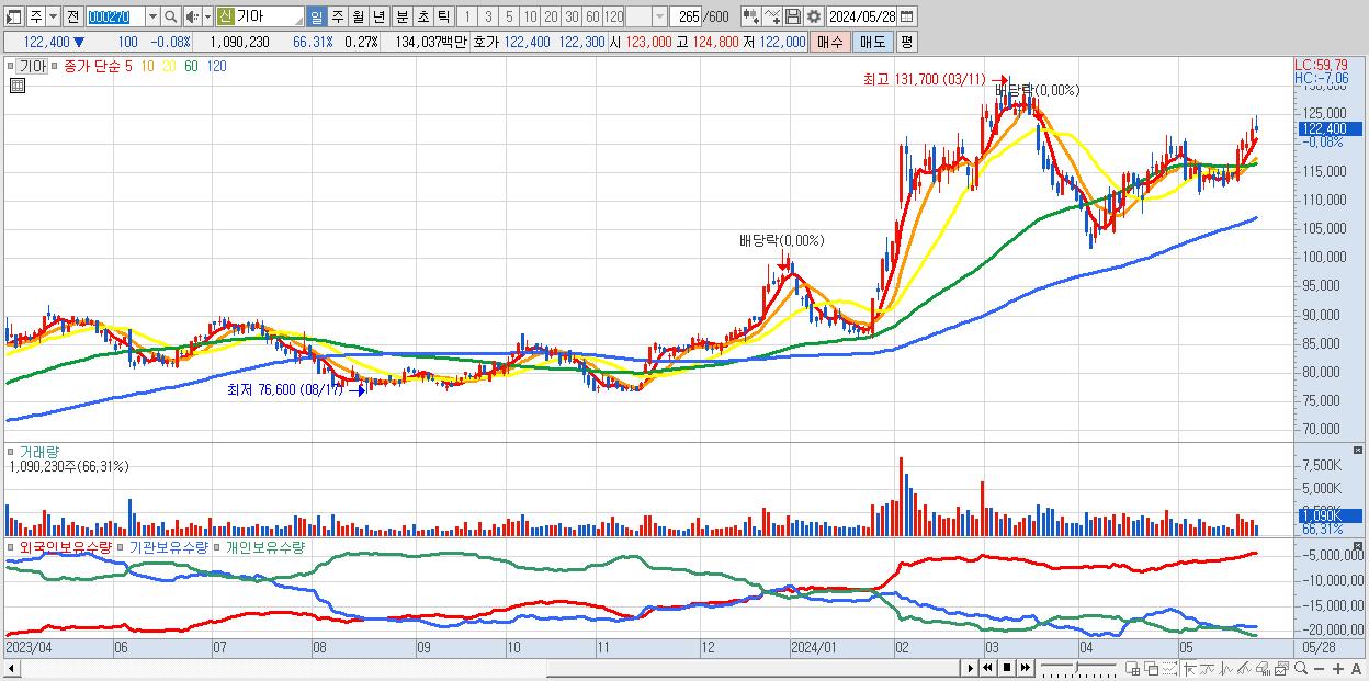 - 기아 (122,400원 ▼ -0.08% , 시총: 489,427억, 외국인 순매수 거래금:191억)