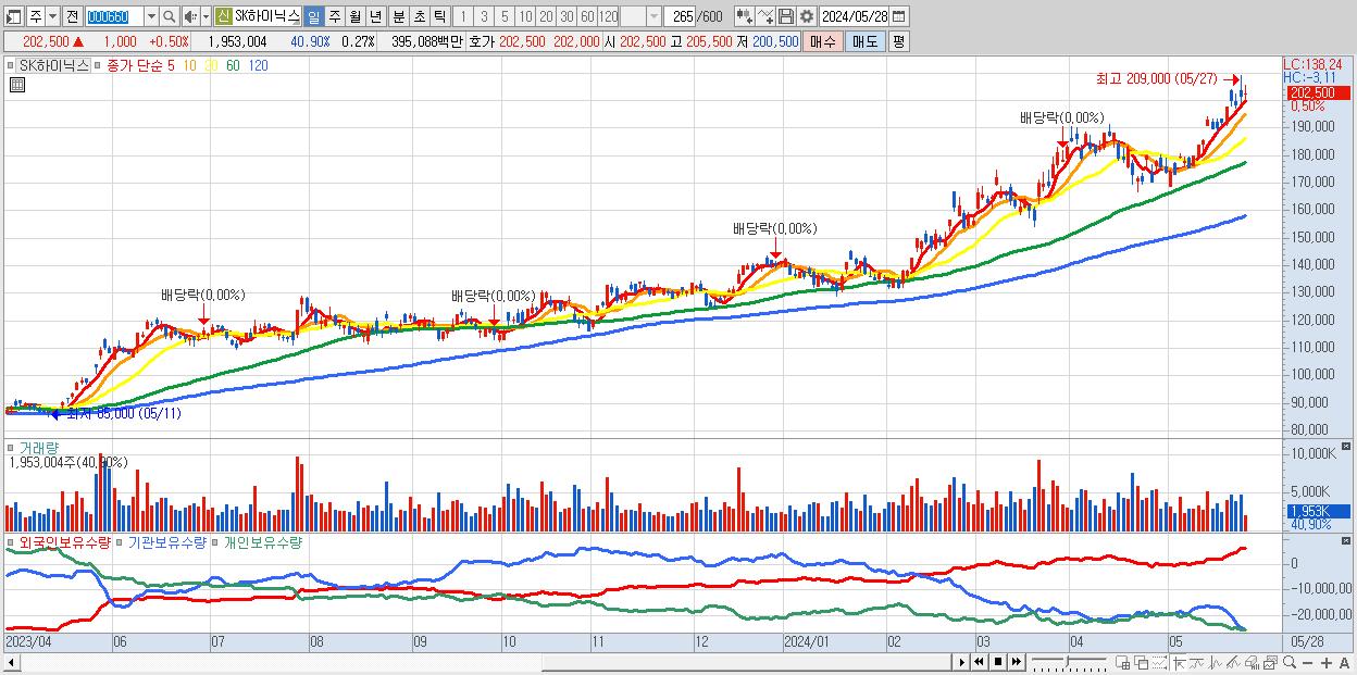 - SK하이닉스 (202,500원 ▲ 0.5% , 시총: 1,474,205억, 외국인 순매수 거래금:185억)