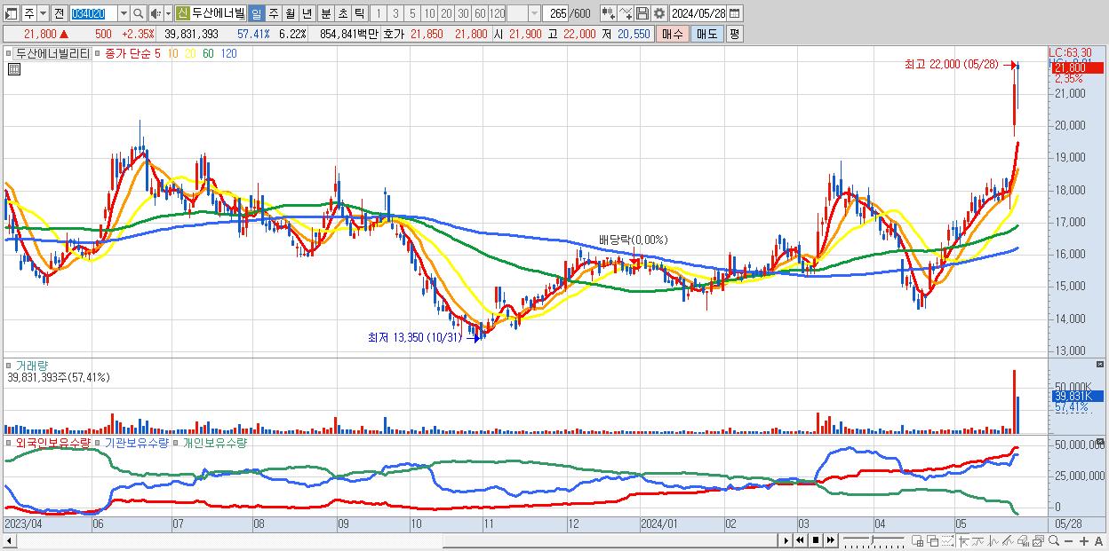 - 두산에너빌리티 (21,800원 ▲ 2.35% , 시총: 139,642억, 외국인 순매수 거래금:369억)