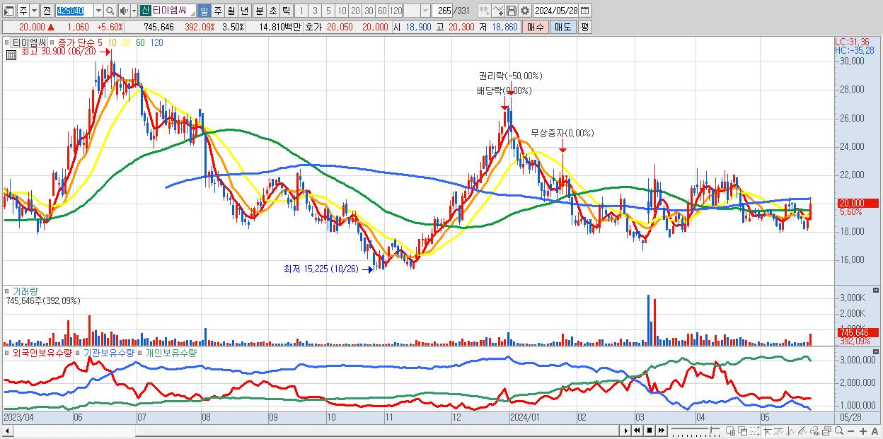 - 티이엠씨 (20,000원 ▲ 5.6% , 시총: 4,260억, 외국인 순매수 거래금:51억)