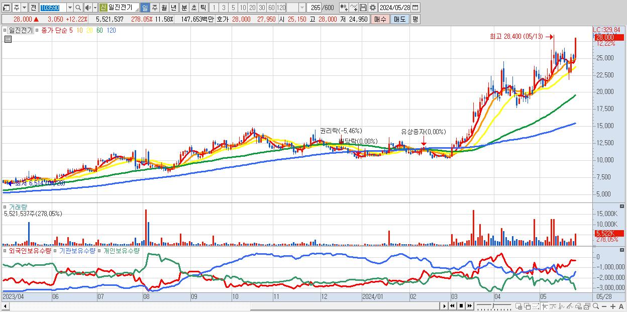 - 일진전기 (28,000원 ▲ 12.22% , 시총: 13,352억, 외국인 순매수 거래금:77억)
